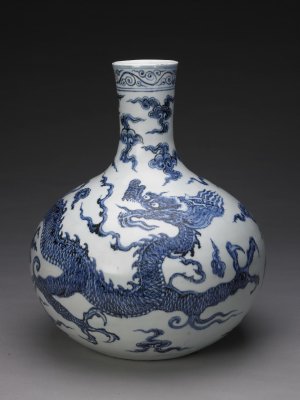 瓶通体青花纹饰,外口饰忍冬纹,颈饰6云朵纹。整个腹部绘云龙纹,龙体较大,张口怒目,鬃发上冲,作回首状,四肢前伸,三爪矫健有力。龙身间隙处饰各种形状的云纹,衬托出巨龙行空之势。青花龙为三爪,怒目回首,鬃鬣飞扬,刻画细腻,颇有气势。使用进口青料描绘花纹,烧制过程中有自然形成的铁结晶斑,更显出龙的凶猛有力,栩栩如生。此器是永乐时期龙纹青花瓷器中的典型之作。