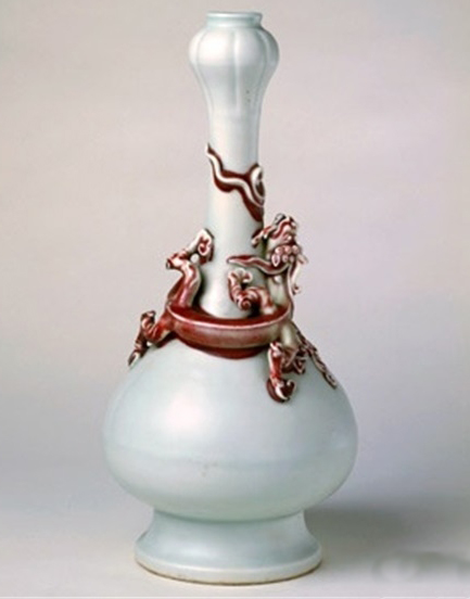 瓶口部刻细线蒜瓣纹,腹部有粘接痕一周。瓶颈至肩部塑贴一条红色螭龙,曲体上仰,口衔仙草,由肩部向颈部盘绕,卷尾与首相接,四肢平伏于瓶肩部。白釉上红螭凸起,效果神奇,颇富艺术感染力。