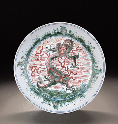 晚明的龙纹,恰如当时社会的政治、经济衰退一样,显得苍老、无力。崇祯五彩龙纹盘的龙纹脸瘦尖,长胡须,蓬头散发,爪似蟹爪,显肚凹腰,恰似一条垂死的老龙。
