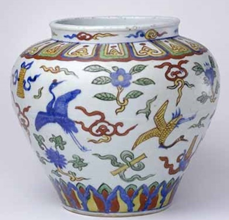 盖罐盖面微现弧度,面饰青花飞龙一条,壁绘斗彩朵云纹。器腹部饰青花三爪飞龙两条,间以绿彩朵云,肩、胫处以黄、红、绿彩分别绘覆仰莲瓣纹。飞龙形象生动,动感强烈,清逸秀雅。此时朵云的形象较之前略显粗糙,造型审美艺术感不足,呈长长的块状,二头一尾、三头一层。