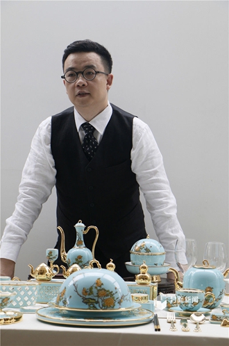 清新通透的粉蓝色搭配高贵华美的金,娇艳欲滴的牡丹花栩栩如生,从酒杯到主餐盘,从菜单到调味瓶,每一件都透露着中国南方温婉贤淑的女子气息。9月6日,封面新闻记者专访了这套餐具的设计师黄春茂,最后一件餐具竟是峰会前三天才赶制完工。