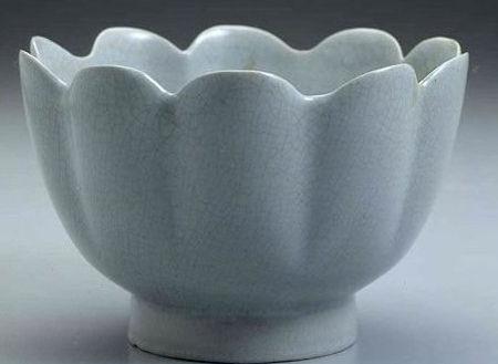 北宋汝窑莲花碗:为台北故宫博物院馆藏国宝,为全球罕见传世珍宝,十吨黄金不换。莲花碗呈十瓣莲花形,俯看形如十曲花瓣,形似一朵盛开的花朵。 莲花碗高10.5厘米,口径16.2厘米,足径8.1厘米,造型比例适度,器身随花口亦呈十瓣,凸凹与莲口相衔接,协调自然,美观大方。