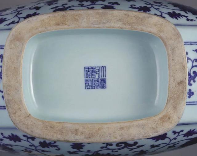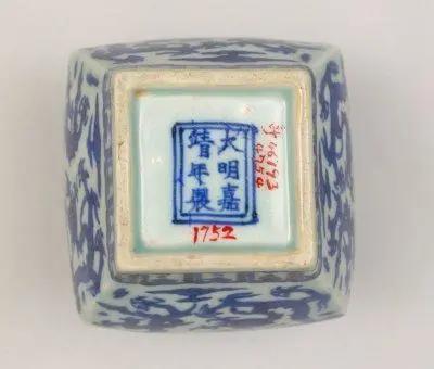 清代康熙款字体工整,青花料色明丽。雍正款楷书苍劲有力,格式讲究。乾隆、嘉庆、道光款多为篆体,字体排列紧密,犹如一枚篆印。近代款识中“江西瓷业公司”款较多,楷书秀逸,其中还有英文款识“CHINA”,是近代出口瓷的标志,是青花中最早使用的英文款。