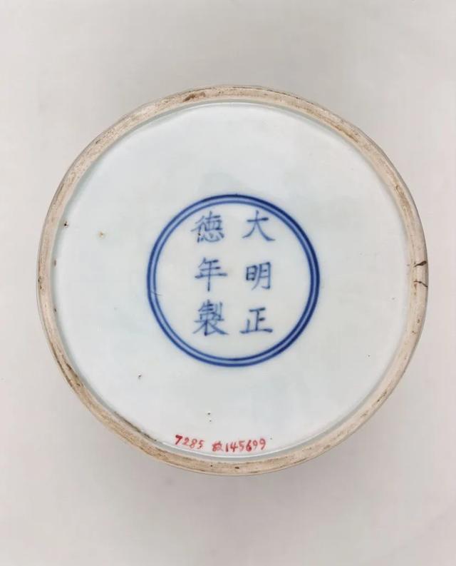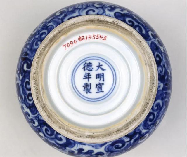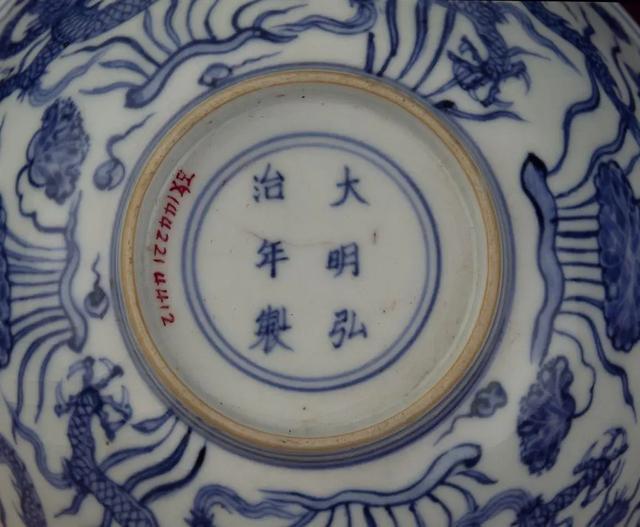 在青花瓷上,用写、刻、印等方法标明瓷器烧造年代的款识,称为纪年款。明代永乐年间,在青花瓷上开始出现纪年款,篆书字体飘逸流畅,边饰莲瓣纹。成化款铁划银钩,釉面有云蒙气。嘉靖款笔画粗重,劲中藏秀。前人曾将明代纪年款归纳为:“宣德款多,成化款肥,弘治款秀,正德款恭,嘉靖款杂”五句话。