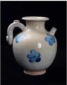 唐代的青花瓷器是青花瓷的萌芽期,处于初创阶段。现在能见到的标本有20世纪70~80年代扬州出土的青花瓷残片二十余片;香港冯平山博物馆收藏的一件青花条纹复;丹麦哥本哈根博物馆收藏的一件鱼藻纹罐;南京博物院收藏的一件点彩梅朵纹器盖。通过对扬州出土瓷片的胎、釉、彩进行研究,初步断定唐青花的产地是河南巩县窑。