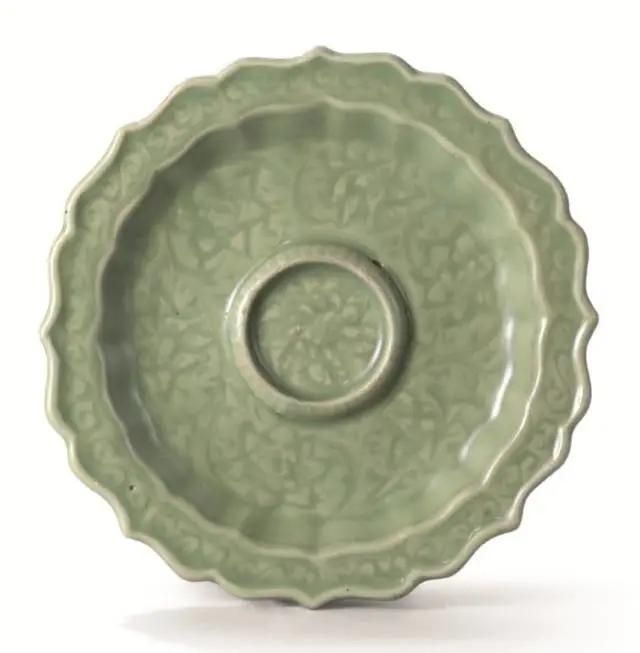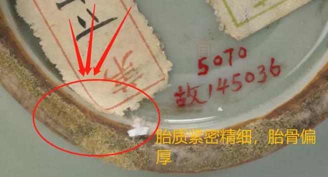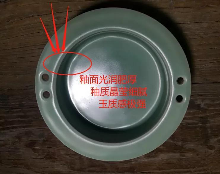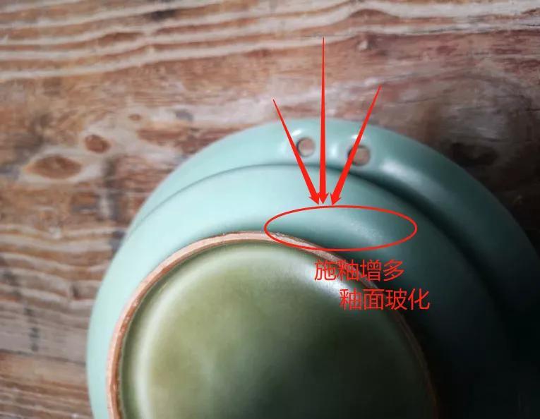 在放大镜下,凡南宋施石灰碱釉的青瓷,釉面可见的密集大小气泡和未溶的白色石英颗粒,至元代釉面的气泡则呈唾沫状,此外,由于宋元时期施釉较厚,留釉较薄而露出白色线状胎色,俗称“出筋”,釉面有无“出筯”,也是鉴识是否宋元器的一个重要依据