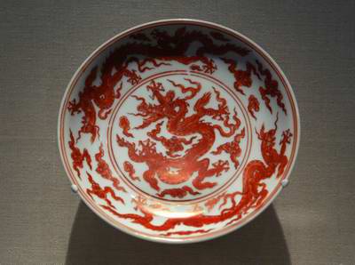 官窑瓷器的纹饰比较工整、细致,民窑器物的纹饰笔法潇洒、自由奔放,生动地表现了对现实美好生活的愿望。画面题材很丰富,人物、花鸟、飞禽走兽无所不有,有些画面取材于锦缎上的纹饰,或受小说木刻插图影响,或取材于戏剧、民间故事传说等。有些内容尤其是在官窑器物上,反映了当时封建统治者的思想意识,有些则带有封建迷信色彩。明代所画的人物比较挺拔,小孩儿头比较肥大,不合比例,前额及后脑凸出,明代早期龙鳞画得比较精细,晚期有的龙鳞画得草率,龙爪画得比清代简单,但龙爪雄壮有力。画龙比较窄瘦、龙咀较长,一般都称为猪咀龙。此时八宝纹的排列多为轮、螺、伞、盖、花、鱼、罐、肠。后仿品有时忽略此点,在鉴定时应注意观察。明代瓷器上有以文字作为纹饰装饰内容,如梵文、阿拉伯文、寿字、福字等。纹饰多为云龙、云凤、缠枝花卉,后来出现人物、飞禽走兽、八仙、人物故事等。官窑瓷器比较工整细致,民窑比较粗放、生动。