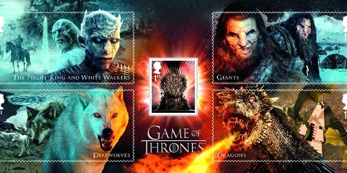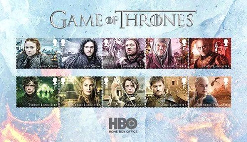 为了纪念HBO电视台的史诗奇幻剧《权力的游戏》,英国皇家邮政发行的“权力的游戏”邮票。1张个角色人物邮票、另外5张邮票是铁王座和非人类的角色。