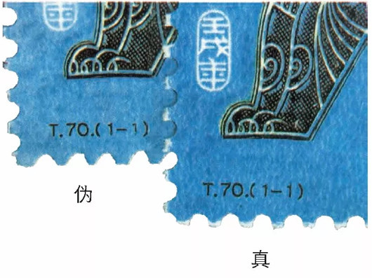 真品《丙戌年》版票上的异形齿孔采用磨合法,齿孔边缘常留有未完全脱落的纸屑;伪品则采用冲压法,齿孔周围光滑,无纸屑。