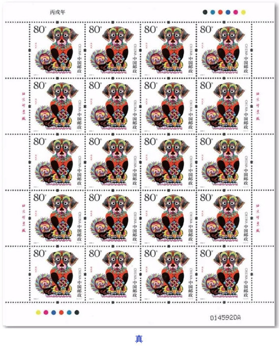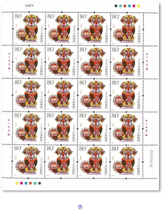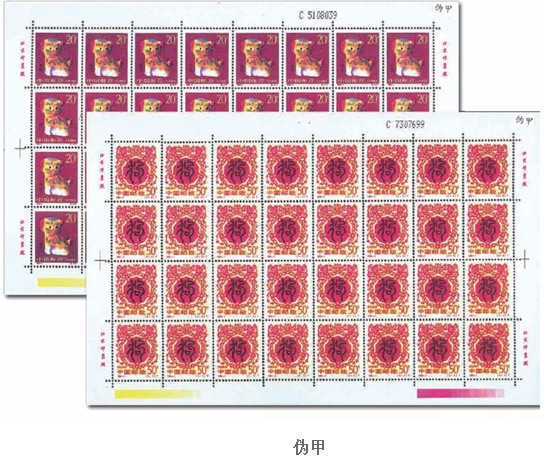 对于《丙戌年》邮局全张邮票的鉴定,在进行上述版别鉴定的基础上,还应该注意邮局全张边纸上的黑色数字喷码特征,真品和伪品所用黑色数字喷码字体有别。在鉴定中还发现,真品与伪品黑色数字喷码喷印在版票纸面上的位置也不一样,真品喷印在版票下边纸右下角,伪品则喷印在版票的右边纸右下角上。