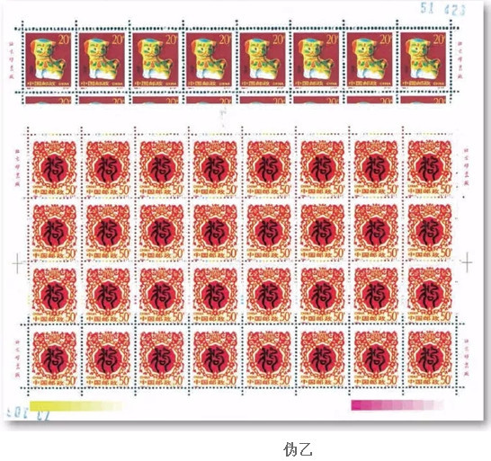 T.70《壬戌年》邮票,除上述变造品外,在鉴定中还发现有采用胶版印制的伪品,采用高科技制版、仿T.70《壬戌年》邮局全张印制。经测量,其采用胶印200线/英寸,彩色套印,各种刷色网纹夹角分别为:红色呈45°,蓝色呈75°,黑色呈15°,铜版纸印制,刷色逼真。用高倍放大镜观察,呈现胶版套印特征,各种刷色混杂在一起,网点大小不同,均呈实心状,无真品采用影雕套印的任何特征。