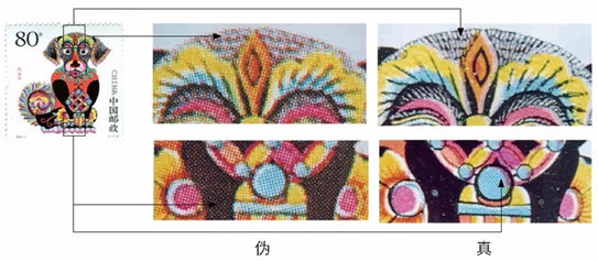 真品《甲戌年》邮票采用影雕套印。影写版印制的图文,各种刷色的网纹夹角均呈45°,圆点大小相同,呈中空状,文字笔画边缘呈锯齿状,雕刻版印制的图案,线条清晰,凸出纸面;伪品采用胶印,各种刷色网纹夹角各不相同,网点呈实心状,经测定,伪甲和伪乙均采用胶版175-200线/英寸套色印制,各种刷色网纹夹角伪红色呈15°,蓝色呈75°,黑色45°,黄色呈0°,而伪乙红色呈75°,蓝色呈15°,黑色呈45°, 黄色呈0°。两种伪品(2-2)中的图案中心篆书“狗”字,均采用黑色网纹版专版套印,这与真品采用雕刻版印制,区别极明显。