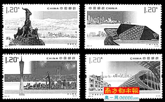 《珠江风韵·广州》是新中国成立后第一套以广州为主题而发行的邮票。四枚邮票分别以五羊塑像、广州大剧院、广州塔、广州国际会议展览中心作为主景,背景则描绘了广州市区内的各式建筑,珠江、猎德大桥、花城广场、骑楼等最具广州特色的风景名胜在四种不同颜色衬托下,广州之美尽显方寸之间,也令人从“国家名片”的邮票中进一步认识广州这座国际大都市的魅力。亚运会闭幕后,与亚运开闭幕式场馆相连的花城广场正式全面对外开放,并成为了广州的“城市会客厅”和城市新地标,每天都吸引了中外游人来到这里游玩,特别在夜幕降临华灯璀璨的时候,东塔、西塔、广州塔、广东省博物馆、广州市图书馆、广州大剧院等建筑更令整个花城广场光彩夺目。