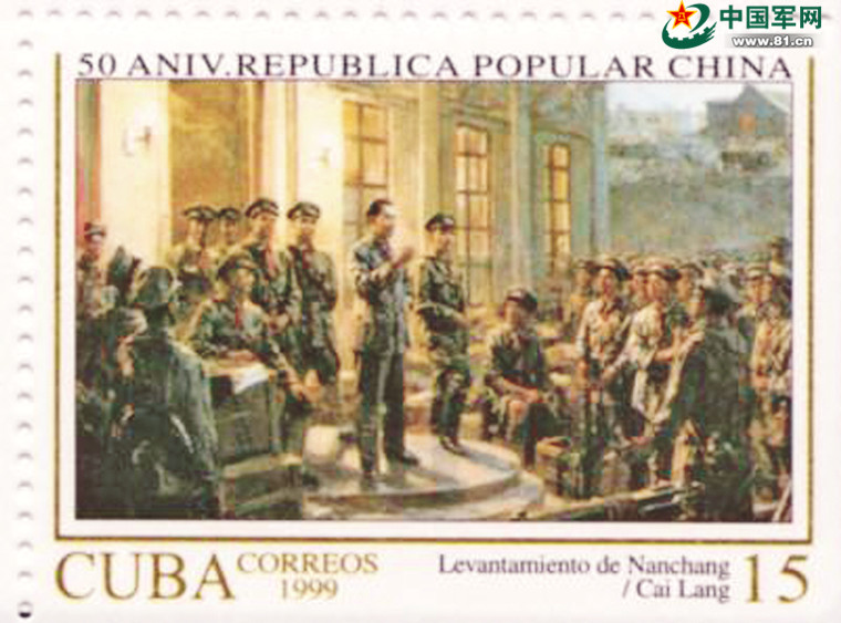 这样一个在中国历史乃至世界历史上都极为重要的大事,自然成为中外多款纪念邮票的素材。如右上这张邮票,即由古巴发行,其上的图案就是那幅广为流传的表现南昌起义场景的油画作品。