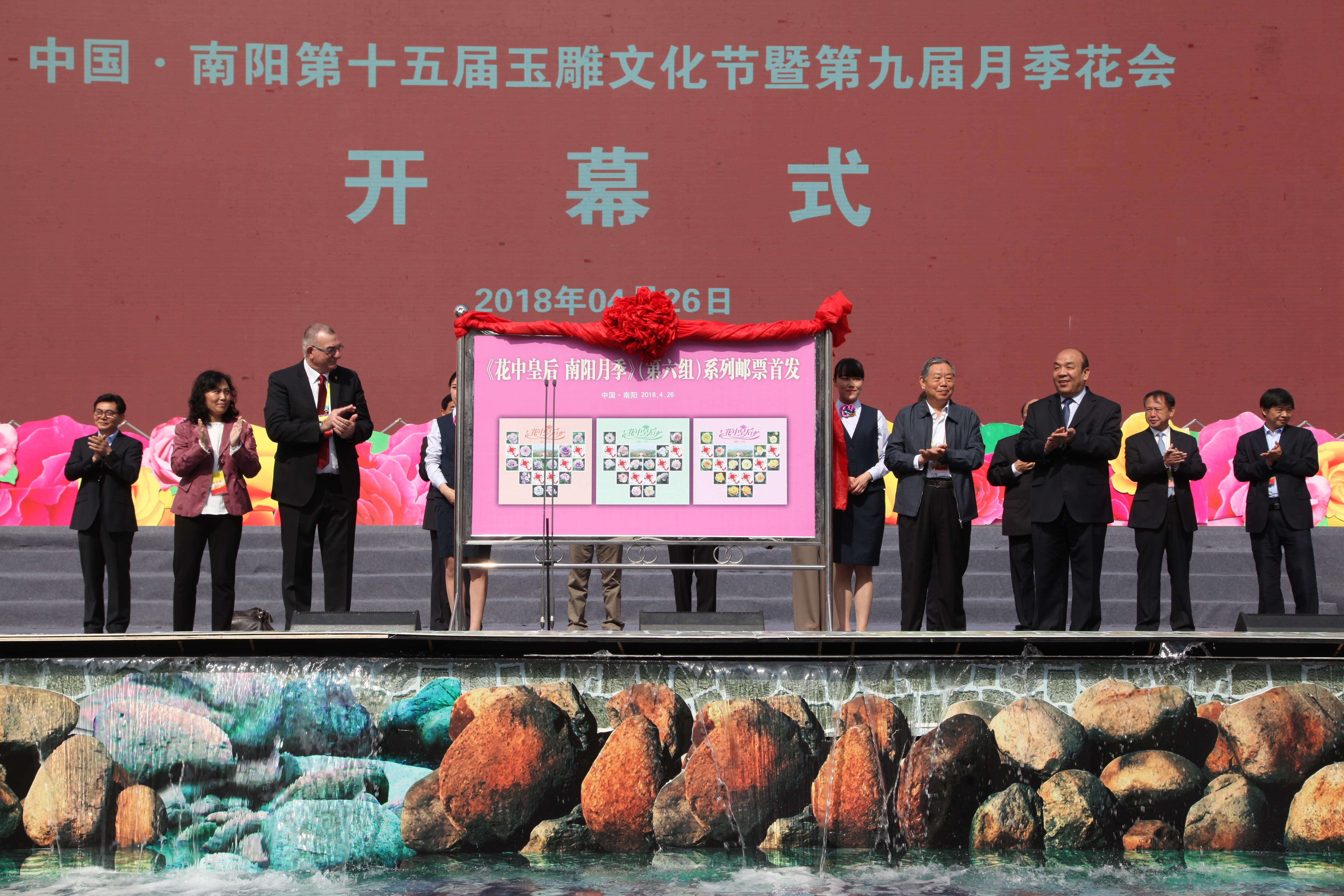 南阳财经网讯(记者王鹏通讯员刘力扬 孙莹莹)4月26日,中国·南阳第十五届玉雕文化节暨第九届月季花会开幕式在南阳市体育场举行。《花中皇后 南阳月季》(第六组)个性化邮票在开幕式上发行。世界月季联合会主席凯文、中国花协副秘书长杨淑艳,河南省花协会长何东成和河南省邮政公司副总经理张军政共同为邮票揭幕。