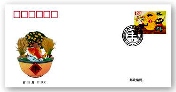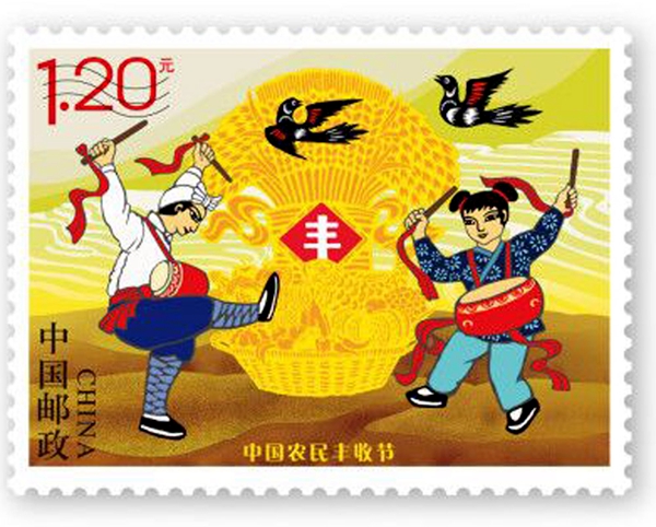 邮票表现了农民在金秋时节庆祝丰收的场景。画面中一对年轻的夫妇在舞动鼓槌欢快地舞蹈,在他们背后,金黄的庄稼溢满粮仓,空中飞来的喜鹊更是增添了丰收的喜庆氛围,画面远处表现了南方的梯田,前景与背景相互呼应,形成了一幅全国上下“庆五谷丰登、享丰收喜悦”的美好画面。