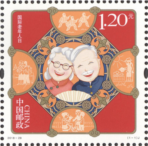 中国邮政定于2018年10月1日发行《国际老年人日》纪念邮票1套1枚,面值1.20元。