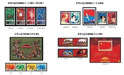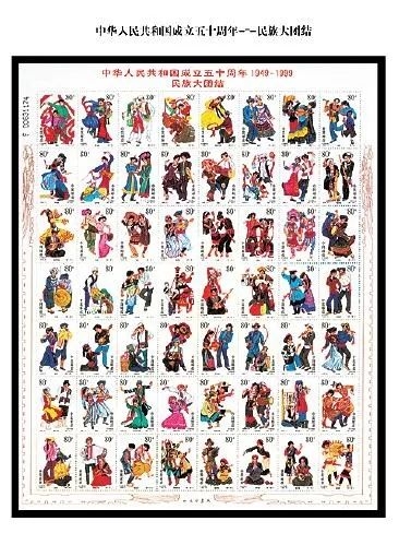 第三展柜展示的是建国题材邮票。在这里我们看到的是《中华人民共和国成立五十周年——民族大团结》邮票,全套56枚在一个版上,表现了56个民族人民身着民族盛装、载歌载舞,迎接共和国五十周年大庆的场景,这套邮票是迄今为止我国发行枚数最多的一套邮票。