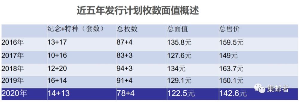 集邮者注:发行计划中不代表最终售价,因为有增发等不确定的情况发生。比如2019年增发的集邮联小型张...因此2020年应该不会是这五年最低的。