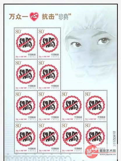 中国邮政于2003年5月19日特别发行了《万众一心抗击“非典”》邮票一套1枚,邮票图案由正反方向众多红心组成的圆圈,既表示爱心,又表示团结一致;邮票中的黑色英文“SARS”字样,是“急性呼吸道综合征”的英文缩写,被一个国际惯用标记红色“禁止”符号所包围,表示坚决抵制“非典”病毒侵害和传播。红与黑的色彩对比醒目而直接,给人们以提示、警告、声援及宣传的作用。