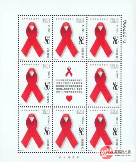 艾滋病被称为“获得性免疫缺陷综合症”,是世界上最难治愈的疾病之一,每年全世界艾滋病携带者约3000万左右。2003年12月1日,中国邮政发行的《世界防治艾滋病日》纪念邮票一套1枚,邮票画面上的交叉红丝带,突出了“相互关爱,共享生命”防治艾滋病主题,飘扬的红丝带鼓励着艾滋病病毒感染者和病人要勇敢面对生活,同时也倡导人们要反对歧视,动员全社会为艾滋病病毒感染者和病人营造一个宽松的生活环境。该套邮票的发行,象征着我国对艾滋病人的理解与关怀,表示着中国对防治艾滋病的决心和信心。