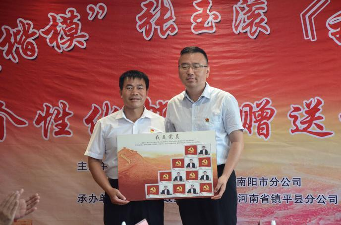 ▲南阳市邮政分公司总经理胡庆魁为“时代楷模”张玉滚同志赠送《我是党员》个性化邮票。图片来源:南阳日报人民号