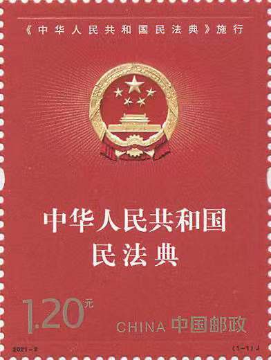 《施行》纪念邮票一套1枚,面值1.20元,发行日期定于2021年1月1日,也就是民法典正式施行之日。