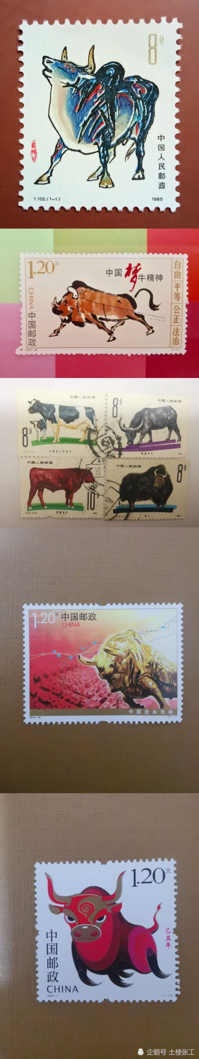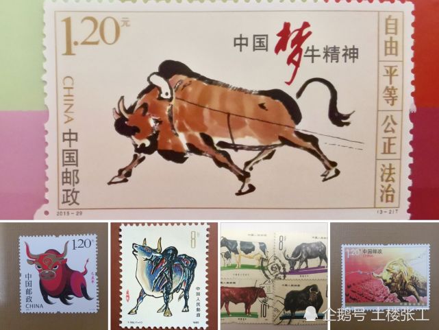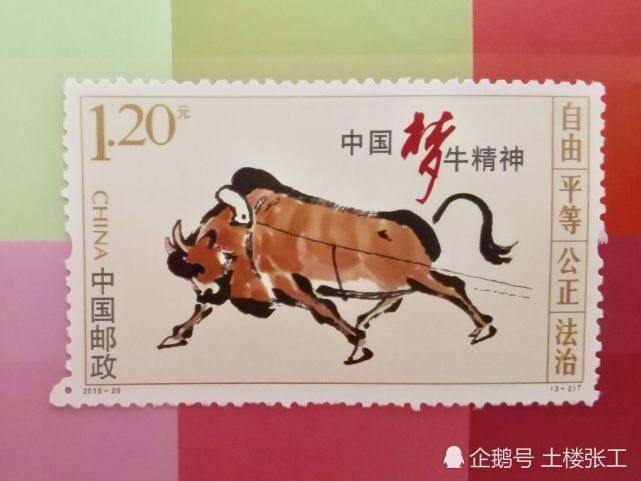 您瞧!这八张牛邮票中的“牛”,品种不同,姿态各异,活灵活现,栩栩如生。它们当中有牦牛、水牛、黄牛,奶牛;有萌萌哒卡通牛;有状若骆驼、仰天长啸的牛。其中一张“中国梦,牛精神”的邮票,画面上的牛形似狮子,拖着犁,阔步前行,一副奋力拼搏、用于担当的模样,颇引人好奇。笔者通过上网了解到,为了响应党十八大提出的“中国梦”和倡导社会主义核心价值观,2015年11月29日,中国邮政发行《图说我们的价值观》邮票,图案分别是“有国才有家”“中国梦牛精神”“中国梦我的梦”,邮票内容选取《鸟巢》《牛精神》《梦娃》三个画面,内容积极向上,全面阐述了“富强、民主、文明、和谐、自由、平等、公正、法治、爱国、敬业、诚信、友善”的社会主义核心价值观的内容。
