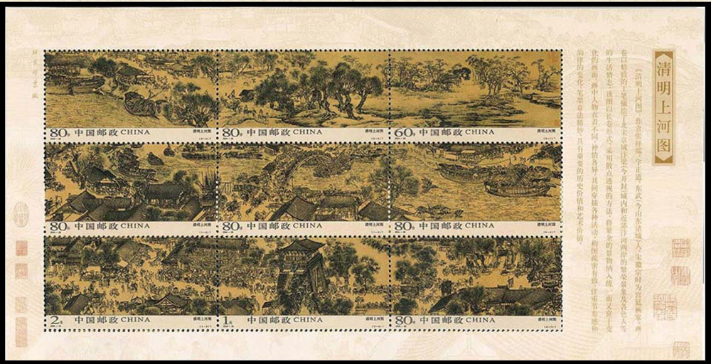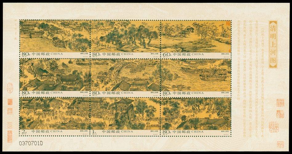 中国邮政《清明上河图》发行于2004年10月18日,全套九枚套票连印,每枚都可独立观赏自成一景,九枚连接起来则是一副完整的《清明上河图》全景,版票面值8.4元。发行量1020万套,由北京邮票厂印制。现在版票市场价格为28元左右。