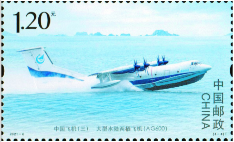 ○第四枚,“大型水陆两栖飞机(AG600)”,表现了两栖飞机水陆两用的特点。