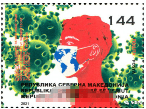 北马其顿的《支持抗击新冠肺炎的医疗卫生工作者》特种邮票以小版张的形式亦于4月16日发行,图案为绿色的新冠肺病毒与戴着印有蓝色世界地图口罩的红色侧面人头像;小版张内含邮票9枚,上下边纸印有票名(含新冠肺炎的名称COVID-19)。今年5月6日,北马其顿总理接种中国产新冠肺炎疫苗,该国大规模的新冠肺炎疫苗接种工作随即展开。
