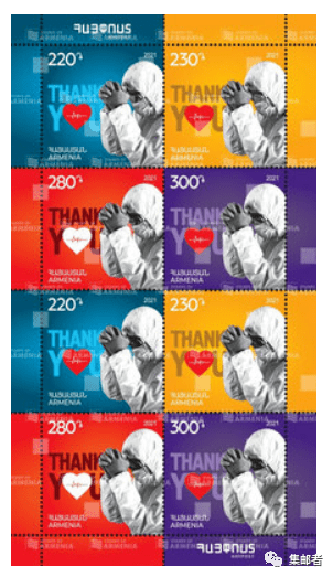 亚美尼亚的《感谢抗击新冠肺炎的医疗卫生工作者》正方形特种邮票以小版张(内含邮票2套8枚)的形式于4月16日发行,1套4枚,图案为以4种鲜艳底色与英文“感谢你”为背景(单词“YOU”中的字母“O”以内有心电波纹的心形代替),衬托着一位抗击新冠肺炎的医疗卫生工作者的黑白色侧面形象,这位抗击疫情者身着防护装备,额头靠向紧握的双手。亚美尼亚在对医务人员优先进行新冠肺炎疫苗接种后,自4月13日开始面向普通民众大范围接种新冠肺炎疫苗。