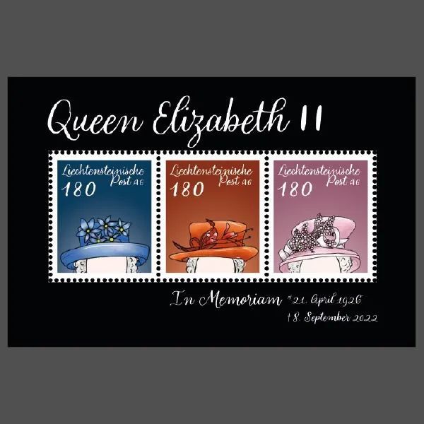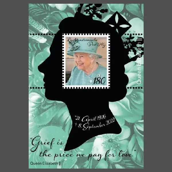 2022年9月8日,伊丽莎白女王二世陛下在苏格兰巴尔莫勒尔城堡去世。各国都发行纪念邮票来追忆这位伟大的女性。列支敦士登邮政也制作了两版纪念邮票。