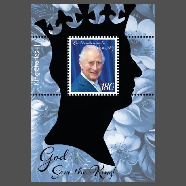 与此同时,列支敦士登邮政也制作了一版英国新君主查尔斯的纪念小版张。查尔斯·菲利普·亚瑟·乔治·蒙巴顿-温莎又称查理三世,1948年11月14日出生于伦敦,是伊丽莎白二世和爱丁堡公爵菲利普亲王的长子。当地时间2022年9月8日,查尔斯三世继承了王位,并发表声明悼念母亲伊丽莎白二世。当地时间9月10日,英国国王查尔斯三世在圣詹姆斯宫正式宣誓登基成为英国新君主。