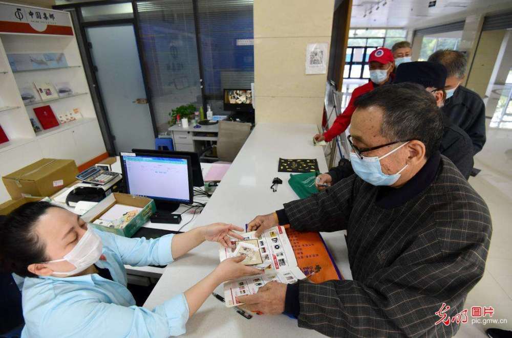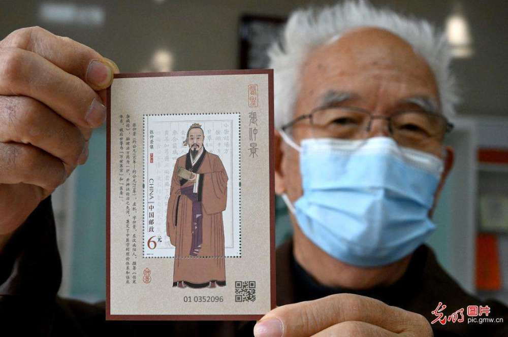 2022年10月22日,中国邮政发行《张仲景》特种邮票1套2枚,小型张1枚。邮票图案名称为坐堂行医、撰书立著,小型张图案名称为张仲景像。全套邮票面值8.40元。图为河北省邯郸市一名集邮爱好者展示《张仲景》特种邮票小型张。(郝群英摄/光明图片) 2022年10月22日,中国邮政发行《张仲景》特种邮票1套2枚,小型张1枚。邮票图案名称为坐堂行医、撰书立著,小型张图案名称为张仲景像。全套邮票面值8.40元。图为河北省邯郸市集邮爱好者购买《张仲景》特种邮票。(郝群英摄/光明图片)