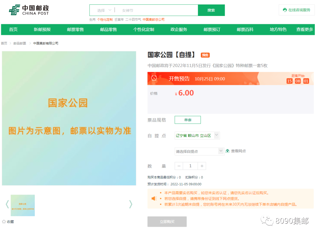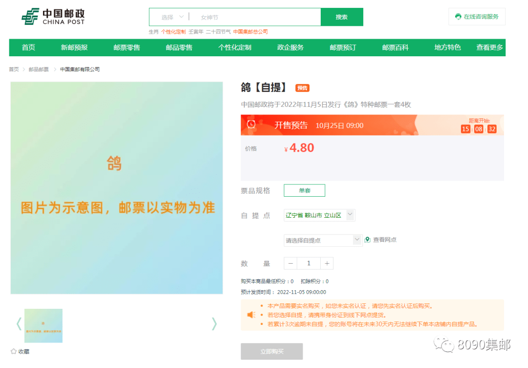 中国邮政将在11月5日发行《鸽》与《国家公园》两套邮票,在这个“双首日”即将来临,中国邮政也将在10月25日开启这两套邮票的【自提】销售:来源:中国邮政线上营业厅排版:8090集邮