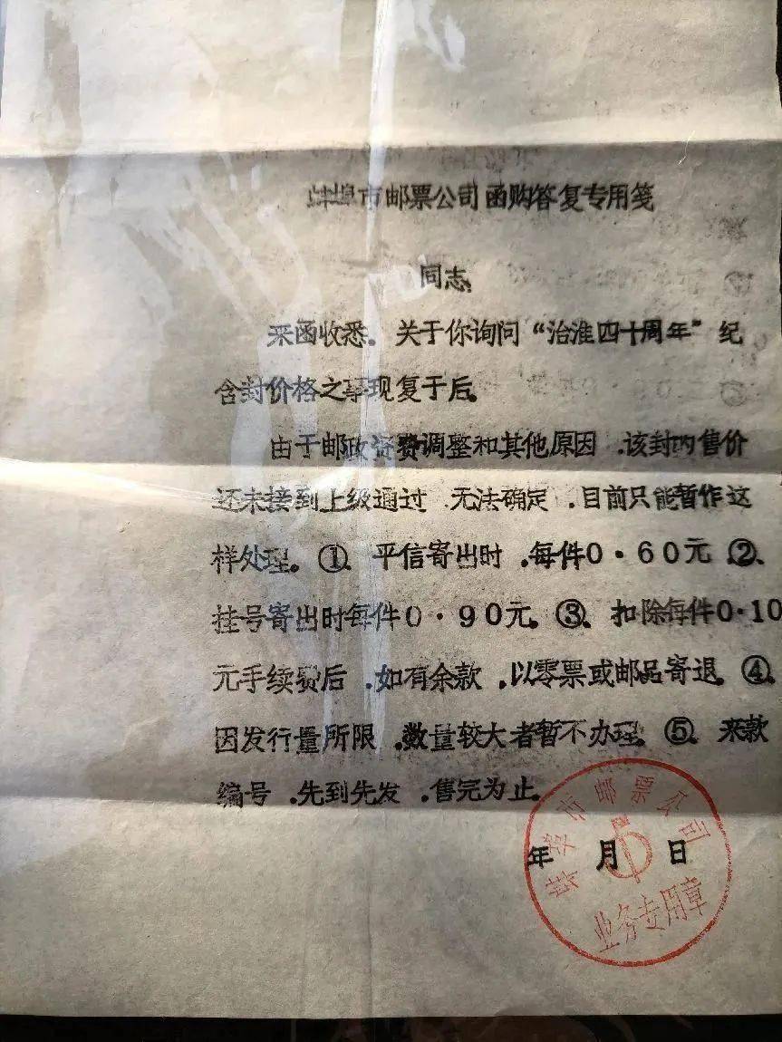 治理淮河40年纪念邮资封于1990年10月10日正式发行。从邮政公事实寄封日期、内附信函日期可知陈姓集邮者在预知发行计划后,在9月15日之前寄函向蚌埠市邮票公司询问纪念封价格,邮票公司在9月15日实寄邮政公事封答复集邮者价格。集邮者9月17日收到公事封,在得知价格后,汇款9元。邮票公司于10月10日正式发行之后的10月14日向集邮者寄出治淮纪念封10枚,并函告集邮者账目明细:每件0.8元,每件手续费0.1元,另多余1元售纪念卡10枚。信函1为邮政公事实寄封内原本的函件,信函2为集邮者因某个原因后放入此实寄封内。如此完整地为三十多年后今日集邮爱好者展示了上世纪集邮方式---向邮票公司函购邮品。