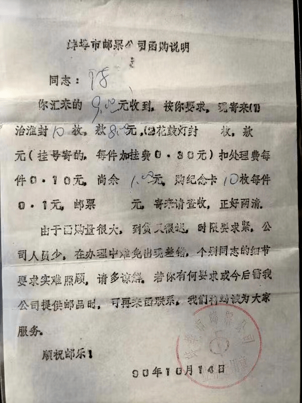 信函2为蚌埠市邮票公司函购说明,文字为油印,另手写人名、数量、价格等数字,落款90年10月14日,盖红色蚌埠市邮票公司业务专用章。