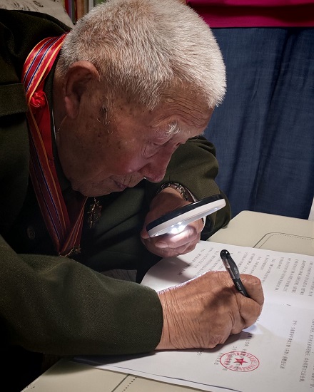 时至今日,他左眼中的弹片依然未能完全取出,眼睛时常发红流泪。1954年部队归国后,他因伤病复员回乡任教,扎根乡村教育43载。直到1998年,由于病情加重,实在无法坚持时,才离开三尺讲台。