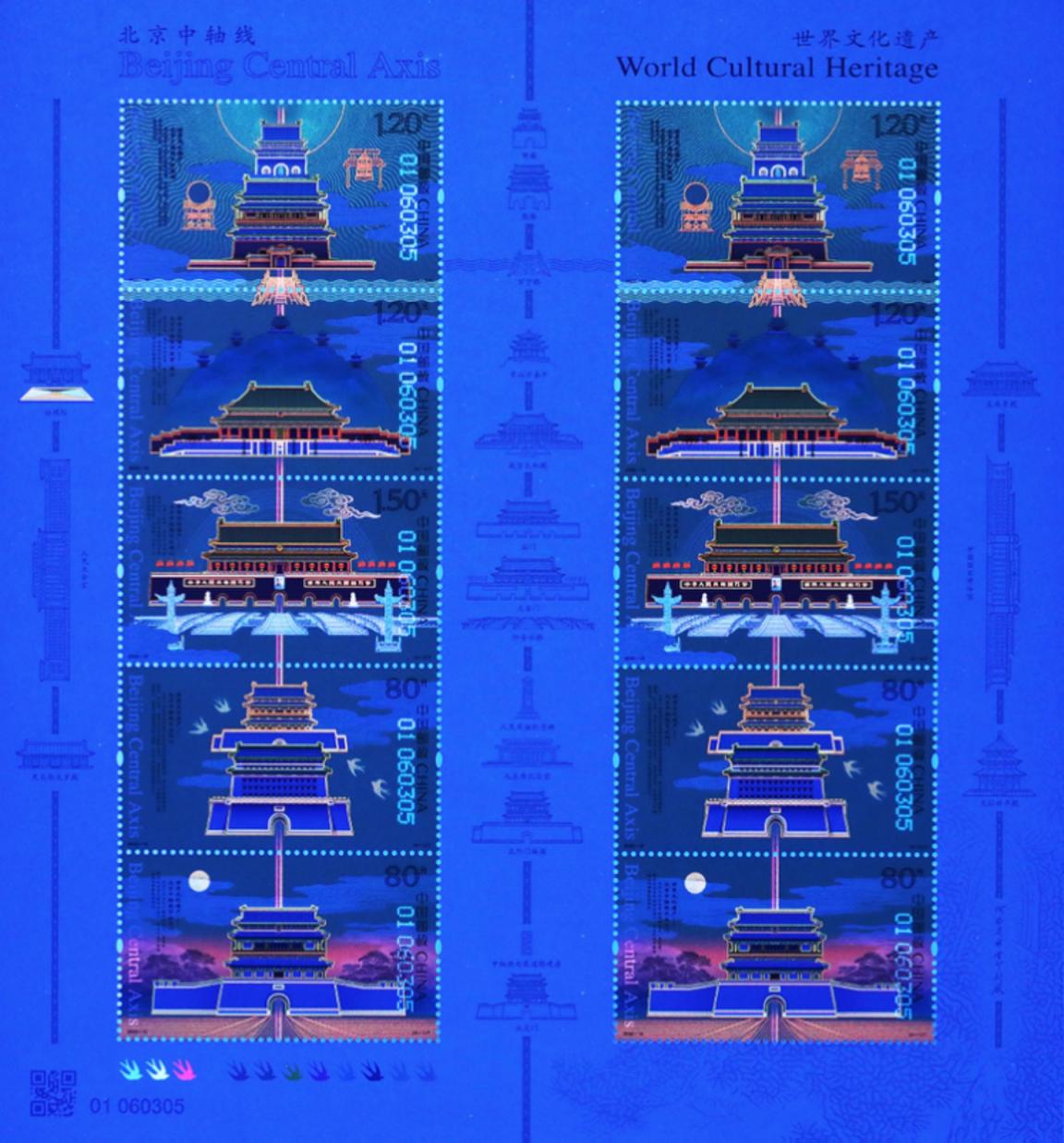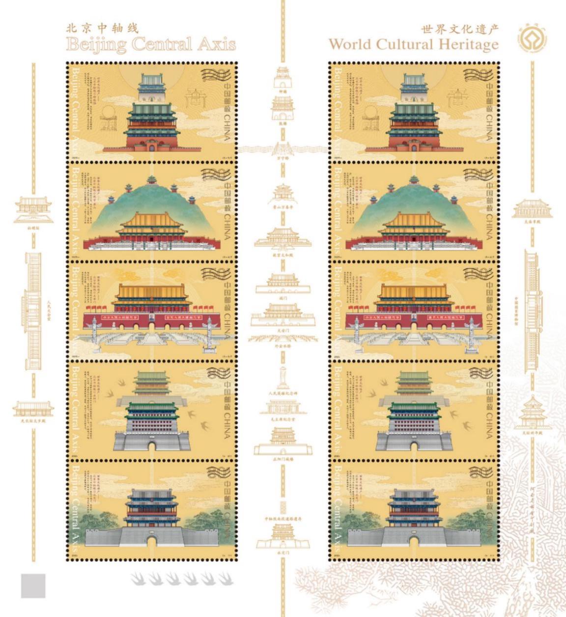 7月27日,北京中轴线申遗成功迎来一周年,中国邮政发行《世界文化遗产——北京中轴线》特种邮票1套5枚。邮票图案名称为:永定门、正阳门、天安门、故宫·景山、钟鼓楼,全套邮票面值5.50元,邮票计划发行数量为套票570万套,版式二69.3万版。 该邮票设计采用中轴对称的构图布局,以平视视角,融合传统青绿重彩的意韵和现代平面装饰的手法,兼工带写,虚实相生之间,表现了北京中轴线从南至北7.8公里的核心建筑。 邮票画面庄重,气势恢弘,展现出北京中轴线的历史发展、文化传承和古代建筑的美学思想,显示出独特的艺术魅力。 据介绍,邮票采用胶雕套印辅以特殊工艺的印制方式,以金色基底作为主色调寓意中华文明的“金名片”。为凸显建筑的线条之美,5枚邮票的主建筑特采用雕刻凹印工艺,精雕细琢的布线使建筑更显井然有序,采用冷烫工艺渲染邮票细节。邮票还采用全真彩印刷工艺,紫光灯下,每一枚主建筑都有与之交相辉映的背景图案,画面动静结合、虚实相生,展现了夜景下北京中轴线建筑的灯火辉煌,实现了“一票两景”的视觉盛宴,寓意着中华民族生生不息、景气和畅的美好祝愿。