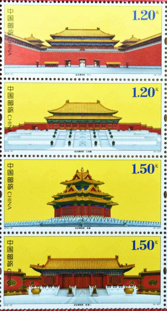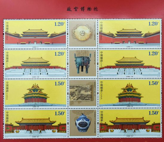 这是10月9日拍摄到的《故宫博物院》特种邮票。 据悉,中国邮政将于10月10日发行《故宫博物院》特种邮票1套4枚,内容分别为午门、太和殿、角楼、乾清门,附票图名分别为:白玉镂雕龙凤璧、水鼎、清明上河图、青花釉里红开光镂花盖罐。全套邮票的面值为5.4元。 新华社发(龙巍 摄) 这是10月9日拍摄到的《故宫博物院》特种邮票。 据悉,中国邮政将于10月10日发行《故宫博物院》特种邮票1套4枚,内容分别为午门、太和殿、角楼、乾清门,附票图名分别为:白玉镂雕龙凤璧、水鼎、清明上河图、青花釉里红开光镂花盖罐。全套邮票的面值为5.4元。 新华社发(龙巍 摄) 这是10月9日拍摄到的《故宫博物院》特种邮票。 据悉,中国邮政将于10月10日发行《故宫博物院》特种邮票1套4枚,内容分别为午门、太和殿、角楼、乾清门,附票图名分别为:白玉镂雕龙凤璧、水鼎、清明上河图、青花釉里红开光镂花盖罐。全套邮票的面值为5.4元。 新华社发(龙巍 摄)