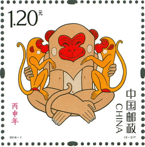《丙申年》特种邮票以两枚一套的形式拉开了第四轮生肖邮票发行的大幕,该套邮票色彩浓烈喜庆,图案内容分别为:灵猴献瑞、福寿双至,全套邮票面值为2.40元。第一图,猴子手托寿桃,面带笑容,形象活泼可爱,生动传神。第二图,一只金猴抱着两只橘色的小猴象征亲情,也寄托着阖家团圆、福寿双至的吉祥寓意。