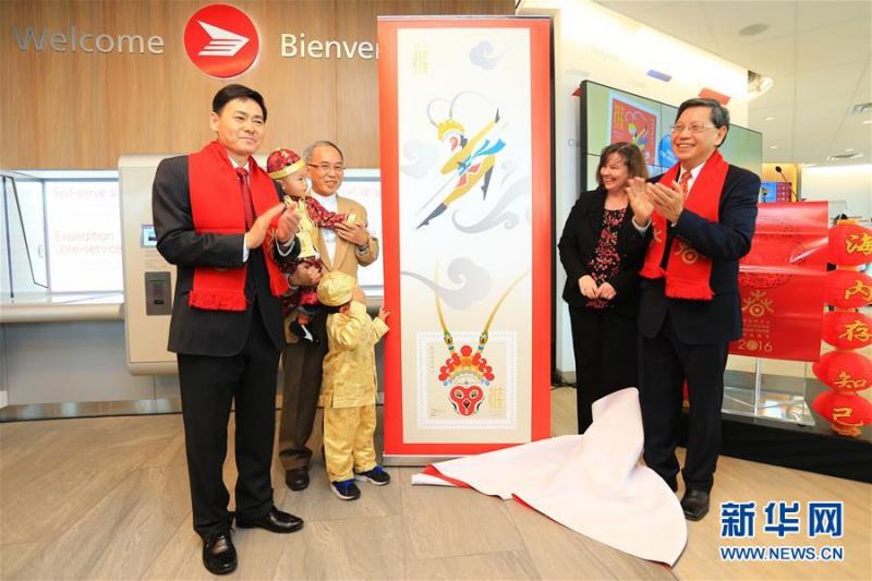 2月4日,在加拿大多伦多地区一家邮局,中国驻多伦多总领事薛冰(左)、设计师伍启荣(左三)、加拿大邮政公司官员金·奥莱莉(右二)与列治文山市议员陈志辉(右)为猴年生肖邮票揭幕。当日,加拿大邮政公司与中国驻多伦多总领馆联合举行“欢乐春节·加拿大猴年生肖邮票国际邮资版发行仪式”。加拿大邮政公司于1997年开始发行中国生肖邮票,今年1月11日已发行了猴年生肖邮票的国内邮资版。新华社发(邹峥摄)