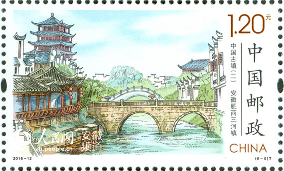 人民网合肥5月19日电(刘甜甜)人民网安徽频道从合肥市获悉,中国邮政于2016年5月19日发行《中国古镇(二)》特种邮票,一套共6枚,邮票图案内容分别为: 江苏姜堰溱潼镇、湖北红安七里坪镇、贵州贵阳青岩镇、上海青浦朱家角镇、安徽肥西三河镇、广西昭平黄姚镇,全套邮票面值7.20元。合肥5A级景区三河古镇荣登该套邮票,是安徽唯一入选的古镇,面值为1.2元。
