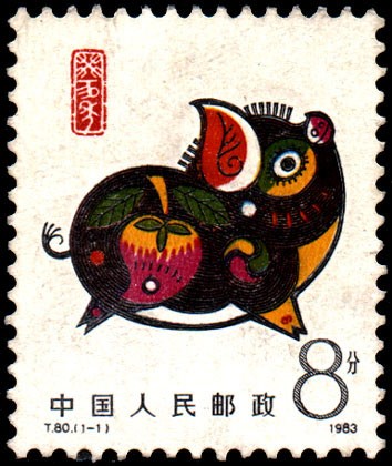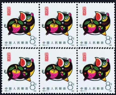《癸亥年》猪票全套共1枚,是我国第一轮生肖猪邮票,1983年1月5日发行的特种邮票。该枚邮票的图案是一只造型活泼可爱,并富有民间美术装饰特色的小猪。以一只被夸张和变形的猪为主体,突出小猪的憨厚和顽皮,用胖乎乎的小猪来预示新年的繁荣兴盛。在用色上,有意使小猪色彩斑澜,使之更显得稚气可爱。