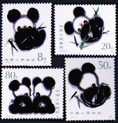 这是我国第一枚“熊猫”邮票小型张。4枚邮票采用了装饰画的手法,原画作者为韩美林,他以独特的艺术魅力,让熊猫活泼可爱的形象淋漓尽致地展现在人们眼前;小型张依然采用了传统的水墨画,有吴作人执笔,邓锡清担纲设计。全套邮票面值1.58元,发行量达1500多万套,小型张面值3元,发行量也有1260多万枚;现该邮票最新价大概为35元。