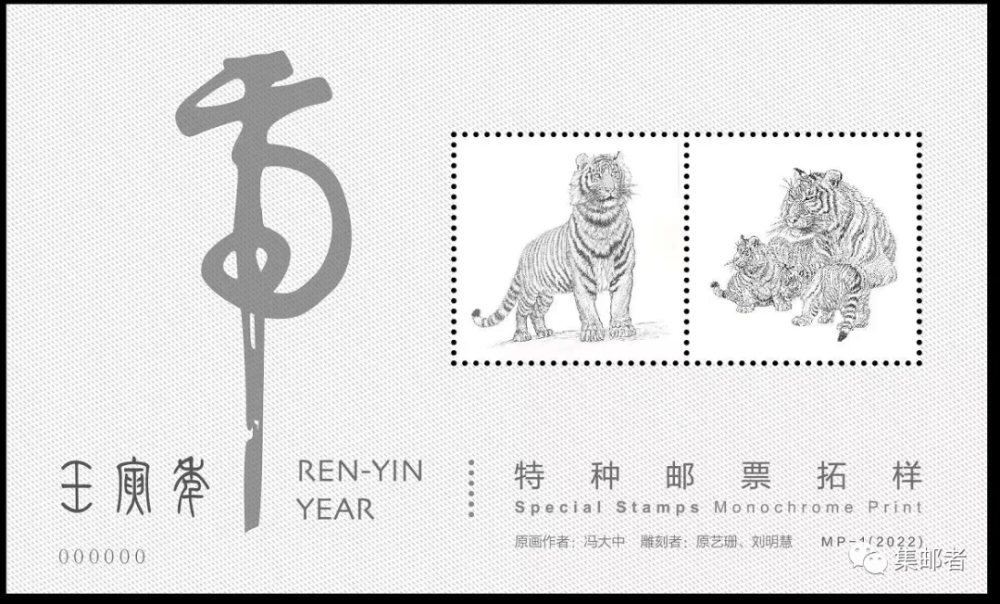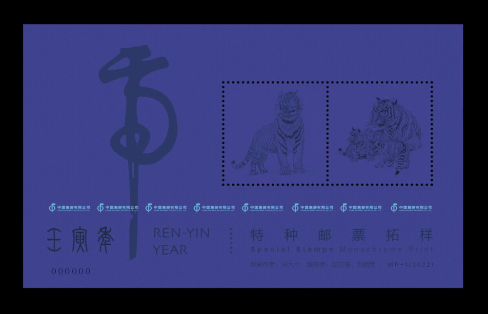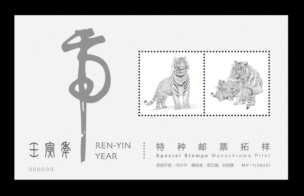 2022年中国集邮有限公司推出的《壬寅年》生肖邮票拓样张,采用《壬寅年》生肖邮票原版印模和邮票专用纸印制,由于去掉了原本邮票中套印的彩色部分,使收藏者的目光能够更加专注于邮票图案的雕版部分。在凹凸有致、极富立体感的印刷油墨中体会光与影的变化,更在点与线的交织中感受虎虎生威的气魄。