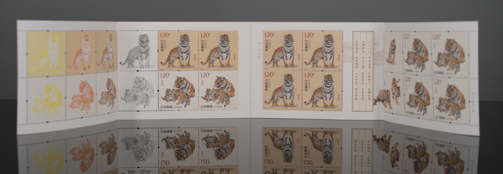 “拓样张”是使用雕刻凹版印模在印刷机上印刷出的单色样张。近年来,我国邮票的雕刻版工艺稳步提升,青年雕刻师成长迅速,刀法精细,点线光洁清楚,深浅富于变化但不紊乱,雕刻出的形象逼真传神,2022年发行的《壬寅年》生肖虎邮票便是其中的经典之作。《壬寅年》生肖虎小本票内页也将该雕刻印样收录其中。