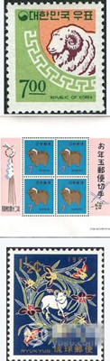 韩国发行的羊年邮票全套一枚,图案是一只绵羊,面值7.00韩元。日本发行的羊年生肖邮票小全张一枚,其中包含4枚邮票。图案也是一只绵羊,面值为7.00日元。琉球地区发行的邮票全套一枚,图案为鲜花围绕的山羊。因当时冲绳为美军管理,使用的美元,故该邮票的面值为1.5美分。