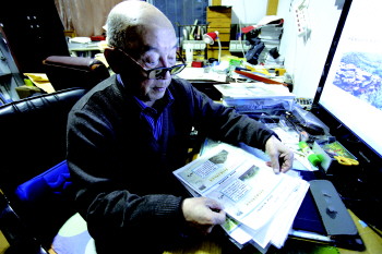 刘丙寅老人把整理好的资料封好。 本报记者 匡璇 摄